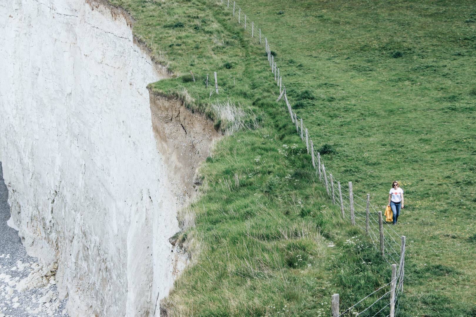 La 1ʳᵉ partie de cette randonnée sur le sentier du littoral nous semble monotone, un ressenti de courte durée. Le sentier du littoral nous tient à distance du contre-bas des falaises d’Ault comme pour nous en protéger ! Depuis 2017, ce sentier a été réaménagé car certaines parties avaient été emportées ! Pour des raisons de sécurité, le tracé est éloigné du bord à une distance minimale de 40 mètres. Le sentier du littoral traverse les prés et longe le Bois de Rompval. Passé les herbes hautes, nous retrouvons le décor vertigineux.