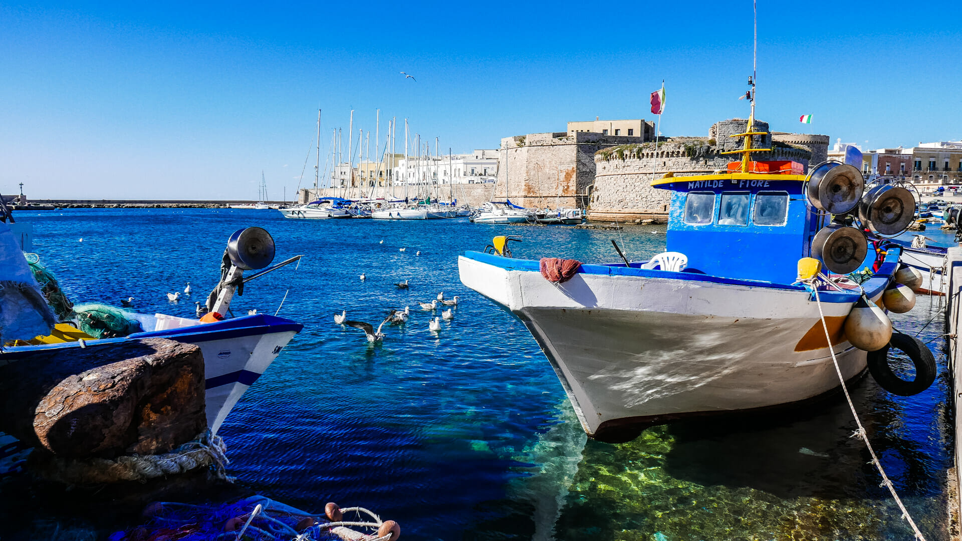 C’est ici que le pouls de Gallipoli bat le plus fort. Dès notre arrivée, nous avons été séduits par l’atmosphère authentique qui règne autour des bateaux multicolores. Les pêcheurs s’affairent, démêlent leurs filets avec une patience infinie, tandis que les mouettes planent dans le ciel, à l’affût. Je me délecte de ce spectacle : l’air marin, la mélodie des vagues contre les coques… c’est un moment absolument délicieux qui fait perdre tous les repères. À voir leurs prises, on comprend vite que la pêche reste l’âme de la région.