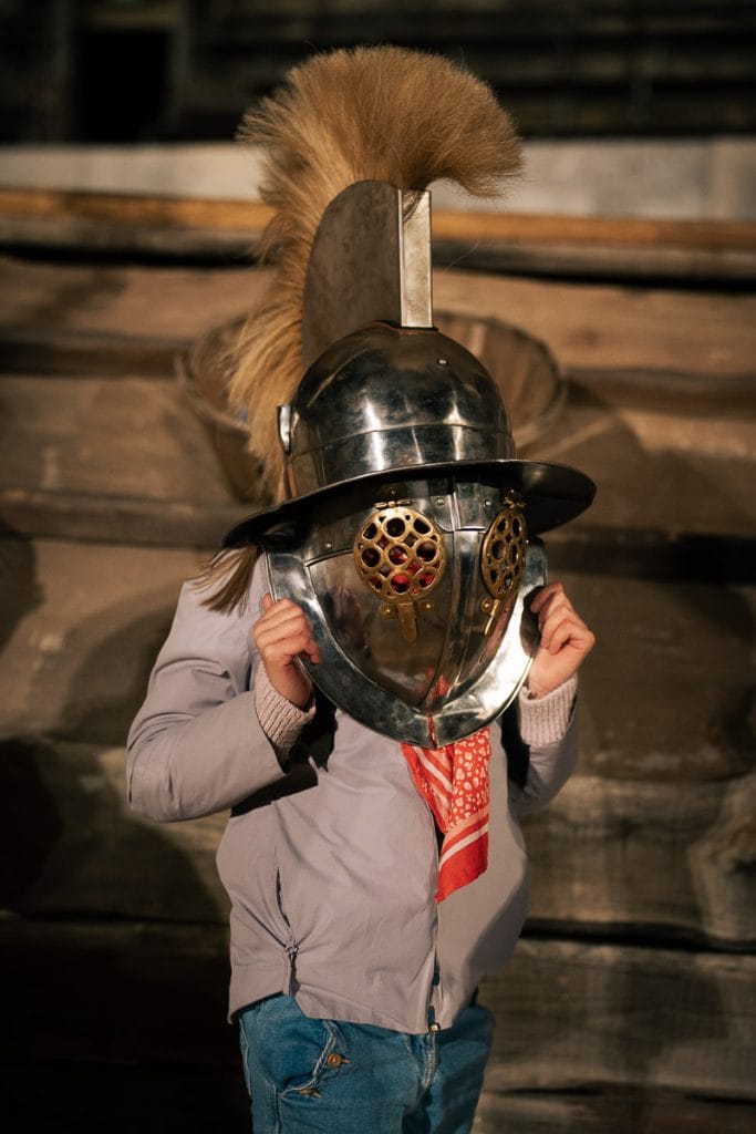 Et pour cause, notre petit groupe est accueilli par la gladiatrice Achillea qui nous guide à travers les galeries de l’amphithéâtre romain. Très vite, on se laisse porter par l’ambiance de cette visite théâtralisée. J’observe Margot déjà captivée par l’univers des gladiateurs. Notre guide nous raconte la vie dans l’amphithéâtre, les jeux, les combats et leurs stratégies. Entre les jeux d’ombres, les voix qui résonnent et la pierre qui se raconte, une atmosphère unique s’installe. On redécouvre les arènes autrement. Comme les places sont limitées, pensez à réserver si vous visitez Nîmes pendant les Journées Romaines, c’est vraiment une expérience à ne pas manquer.